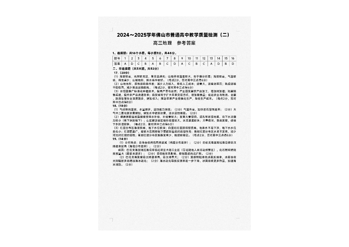 广东省2024-2025学年佛山市普通高中教学质量检测(二)地理答案.pdf
