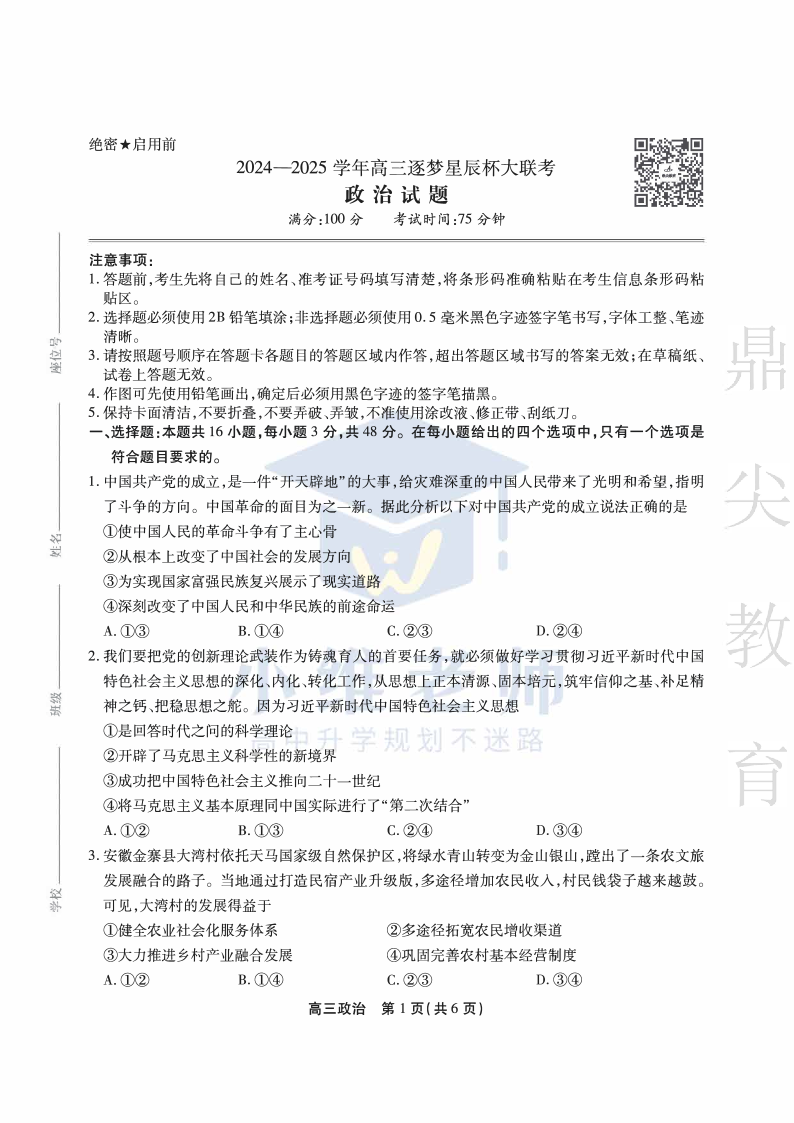 安徽省鼎尖教育2025届高三逐梦杯实验班大联考 政治.pdf