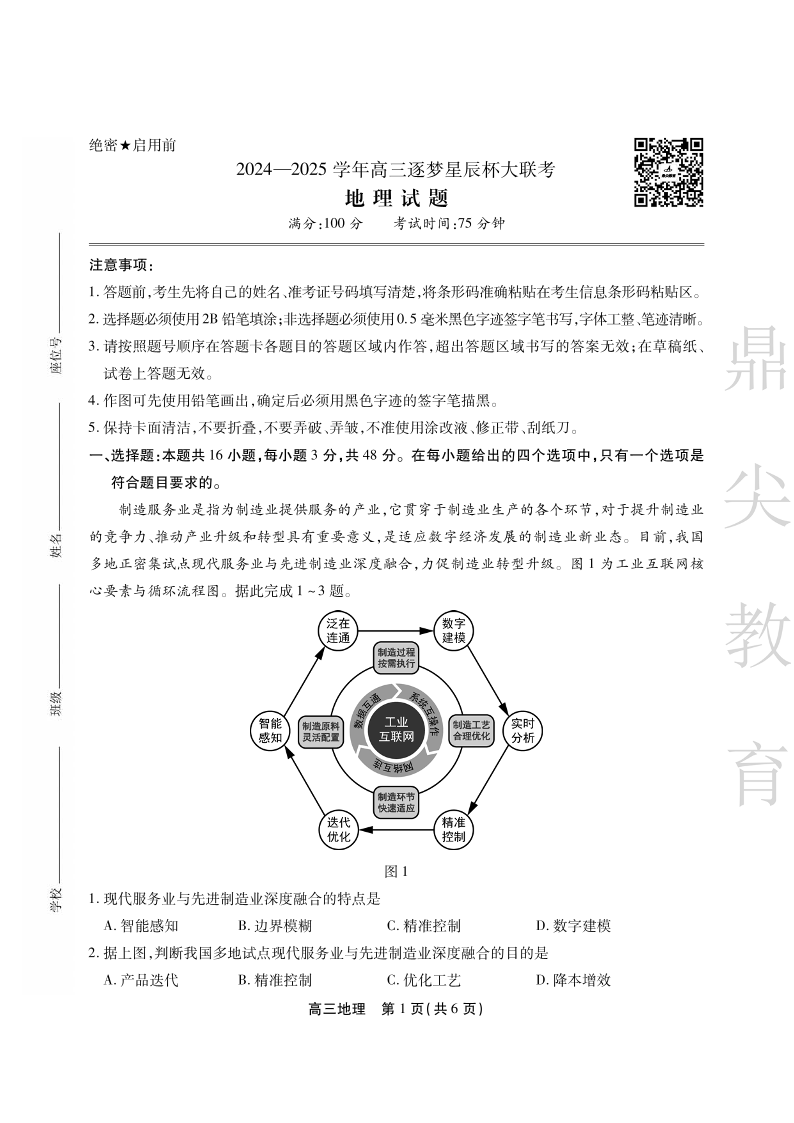 安徽省鼎尖教育2025届高三逐梦杯实验班大联考 地理.pdf