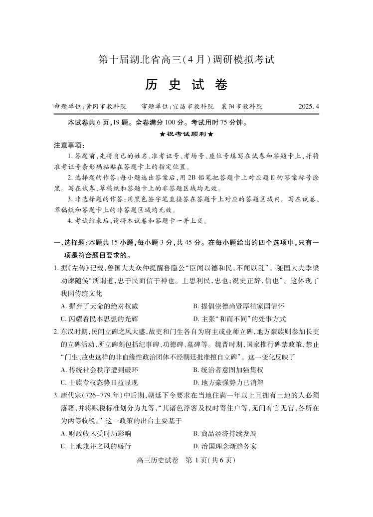 第十届湖北省高三(4月)调研模拟考试 历史.pdf