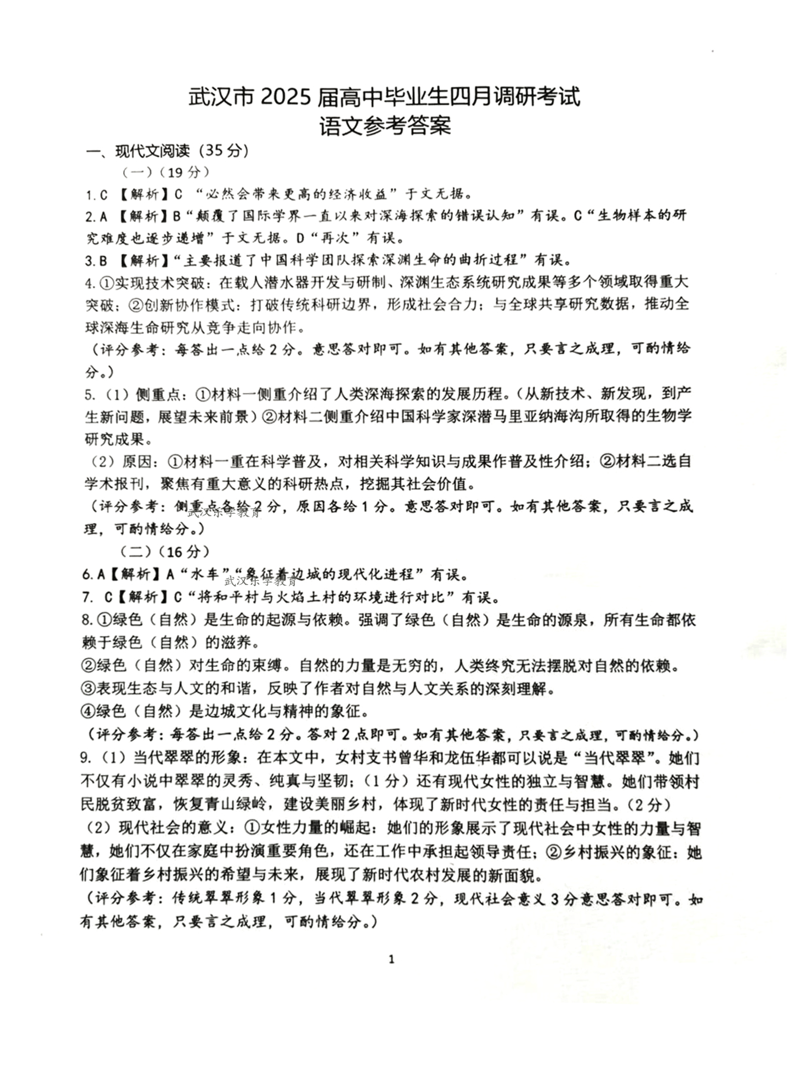 湖北省武汉市2025届高中毕业生四月调研考试 语文答案.pdf