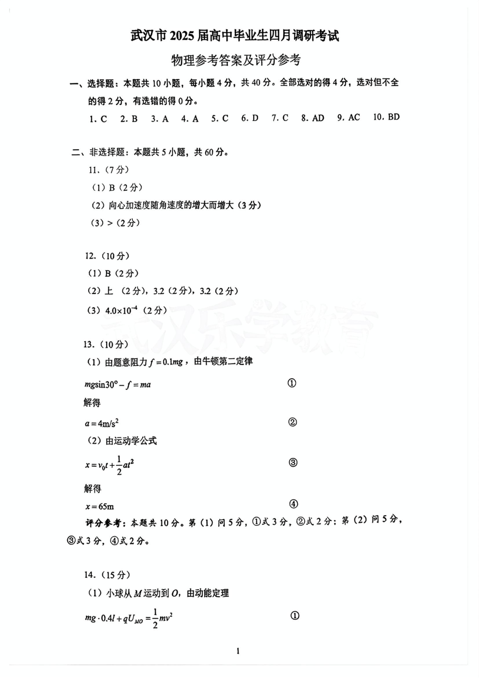 湖北省武汉市2025届高中毕业生四月调研考试 物理答案.pdf