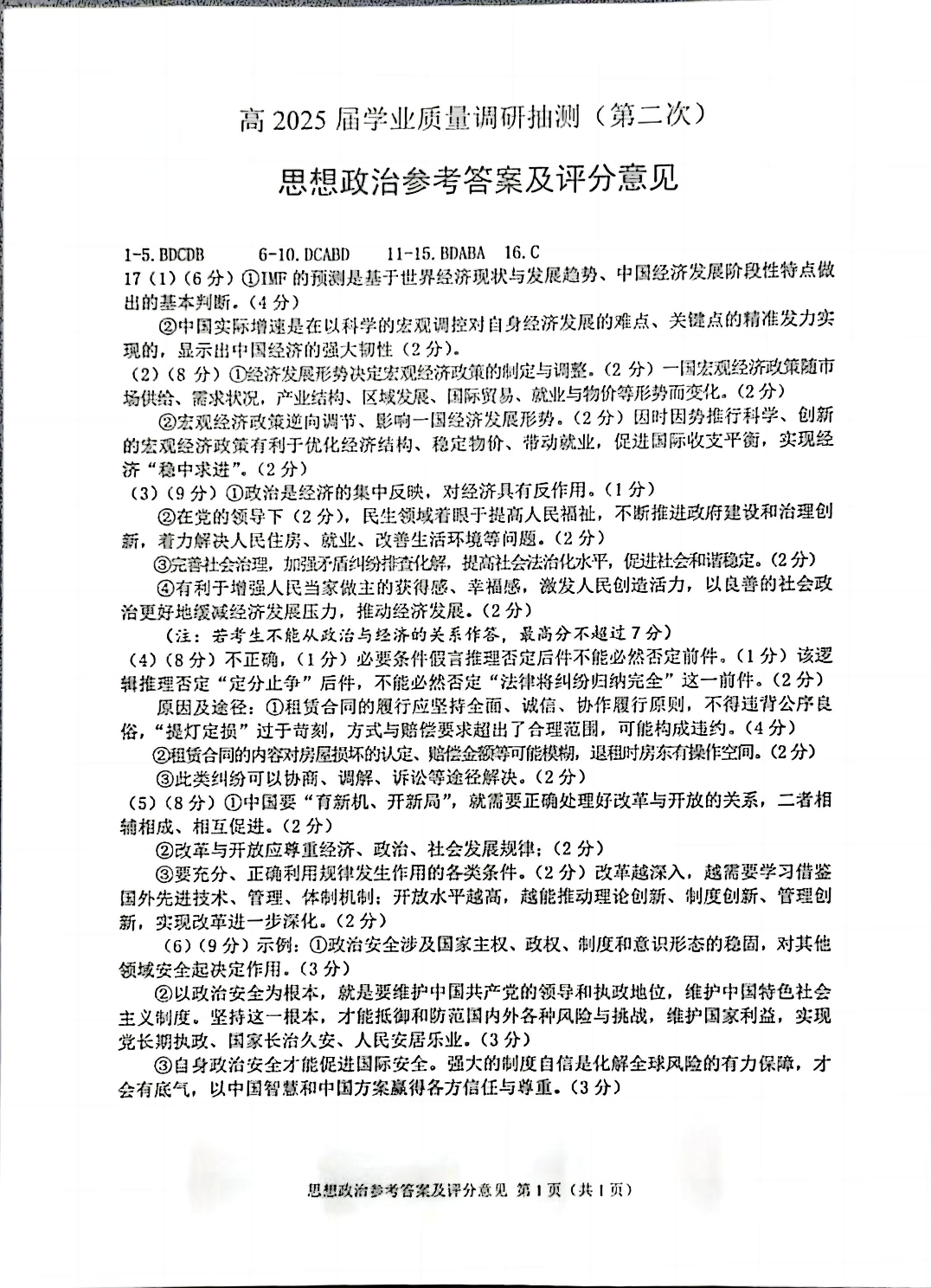 重庆市2025届主城五区学业质量调研抽测(第二次)政治答案.pdf