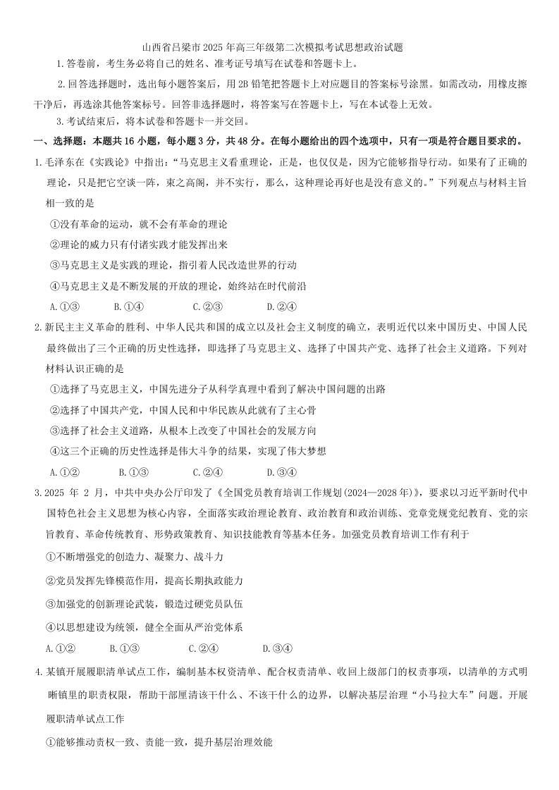吕梁市2025年高三年级第二次模拟考试 政治(含答案).docx