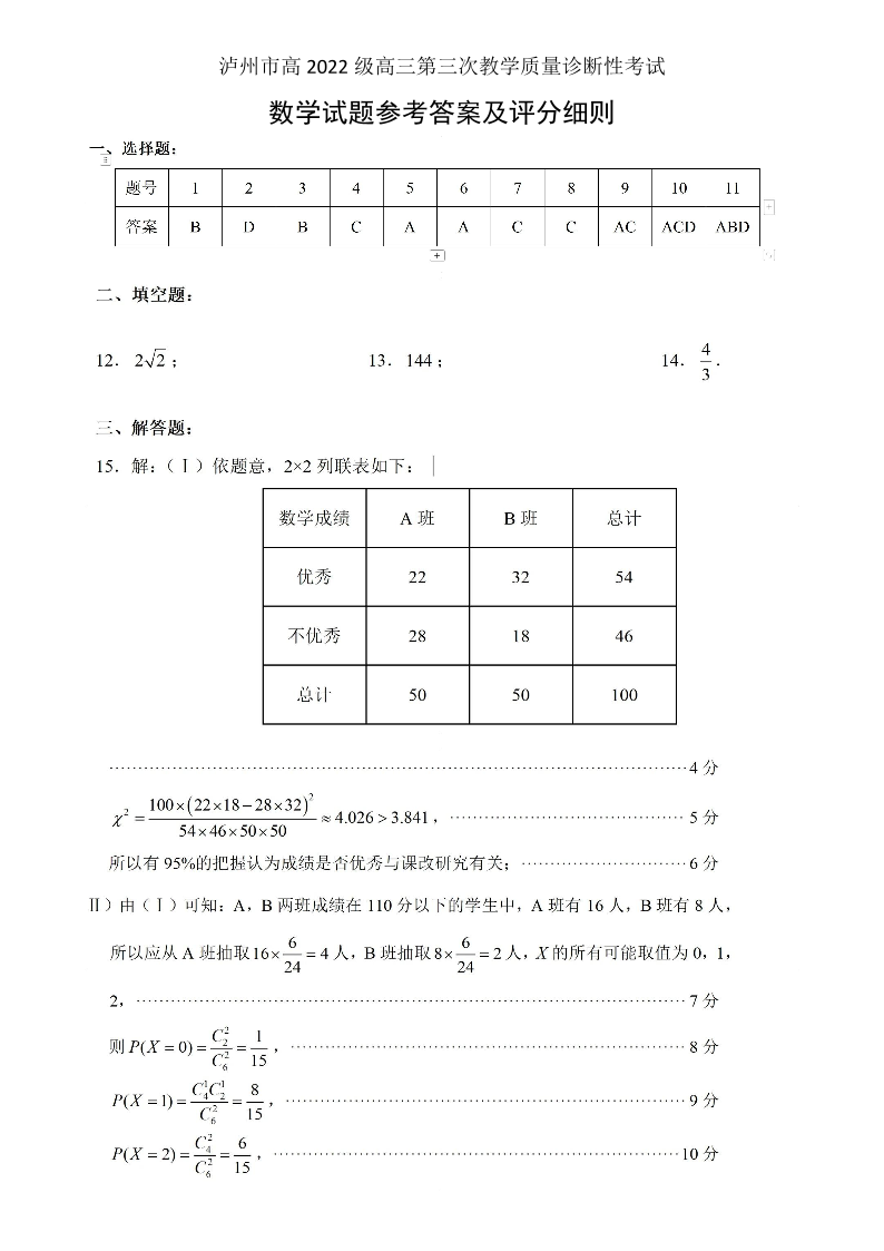 四川省泸州市高2022级第三次教学质量诊断性考试 数学答案.pdf