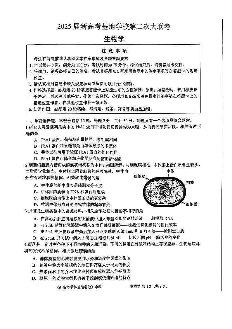 江苏省南通市2025届新高考基地高三第二次大联考 生物(含答案).pdf