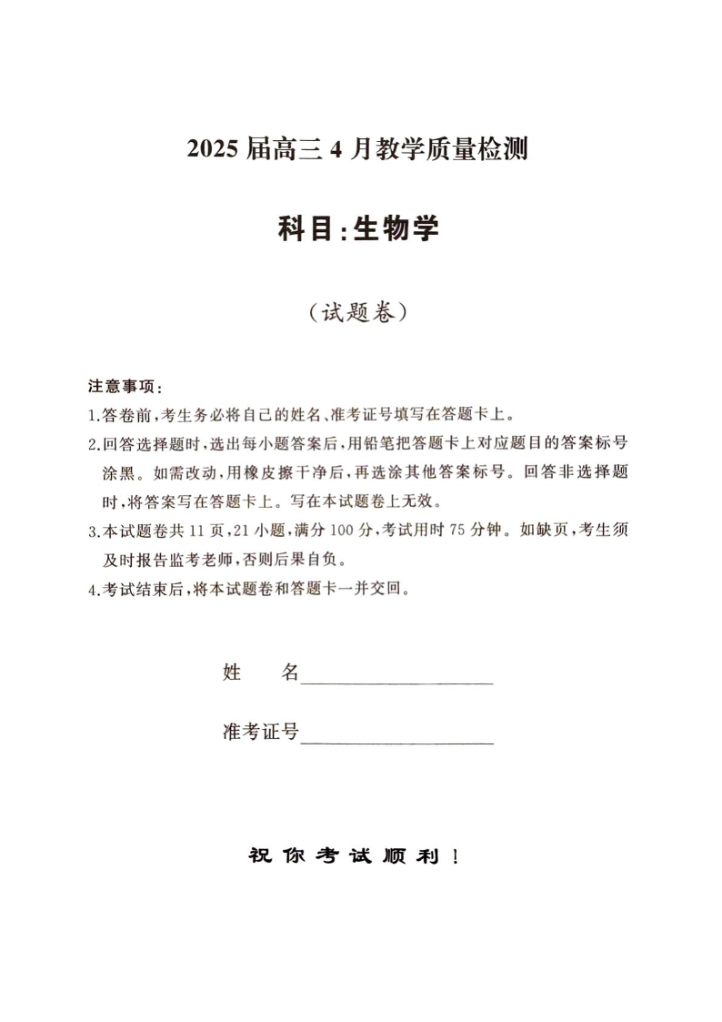 湖南天壹名校联盟·2025届高三4月大联考 生物.pdf