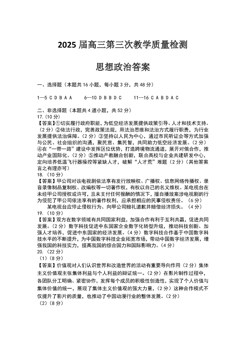 大庆市2025届高三年级第三次教学质量检测 政治答案.pdf