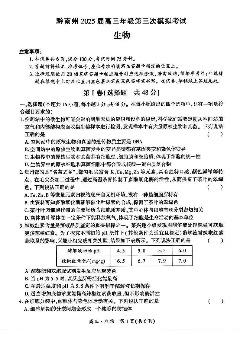 贵州省黔南州2025届高三年级第三次模拟考试 生物.pdf