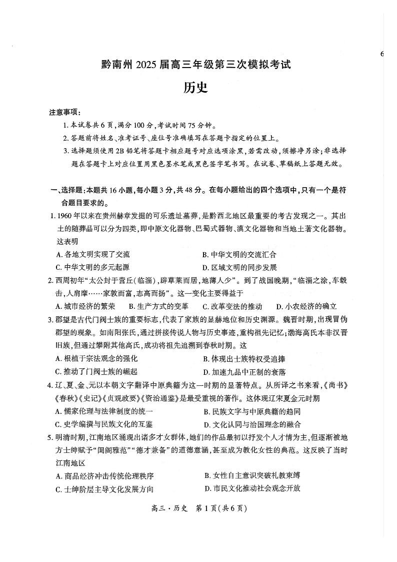 贵州省黔南州2025届高三年级第三次模拟考试 历史.pdf