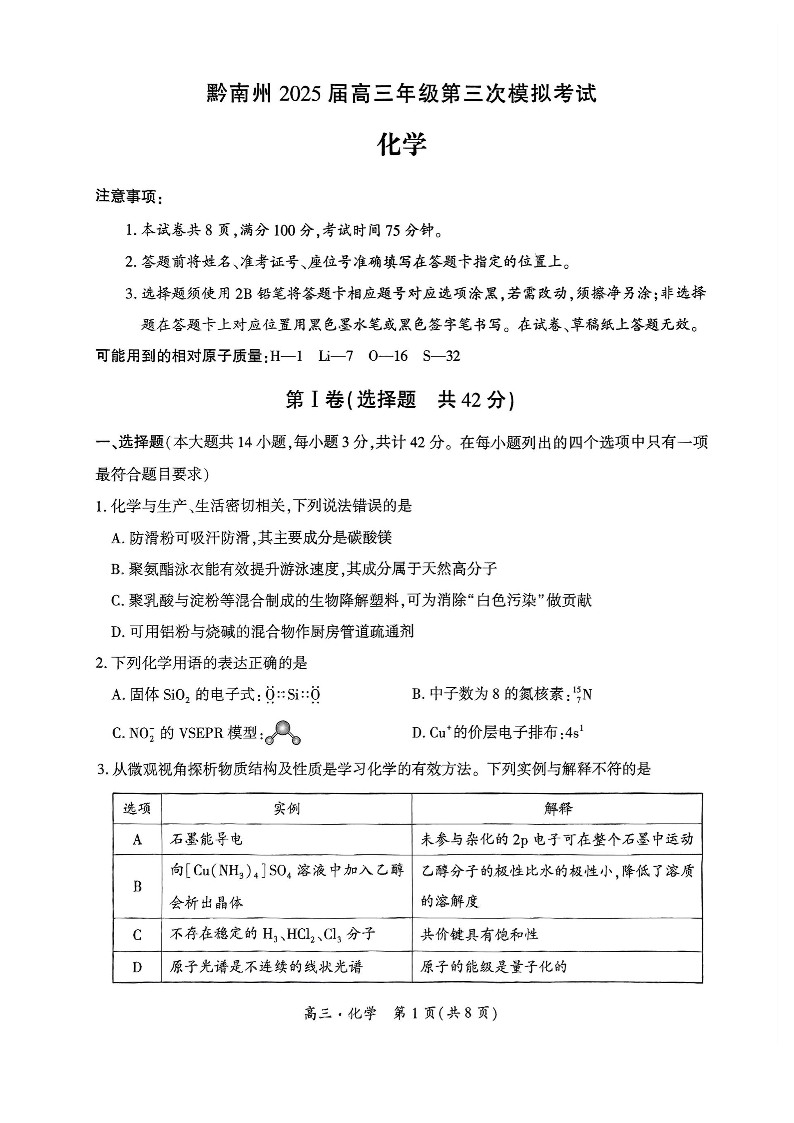 贵州省黔南州2025届高三年级第三次模拟考试 化学.pdf