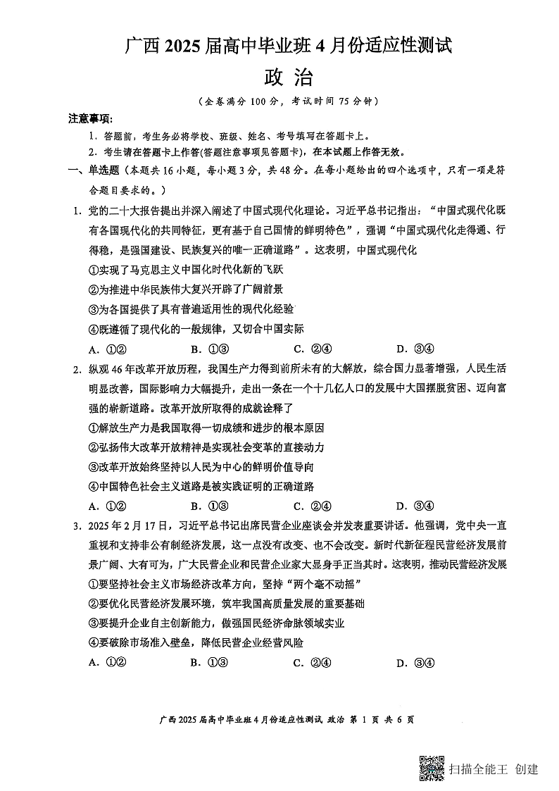 广西2025届高中毕业班4月适应性测试 政治.pdf