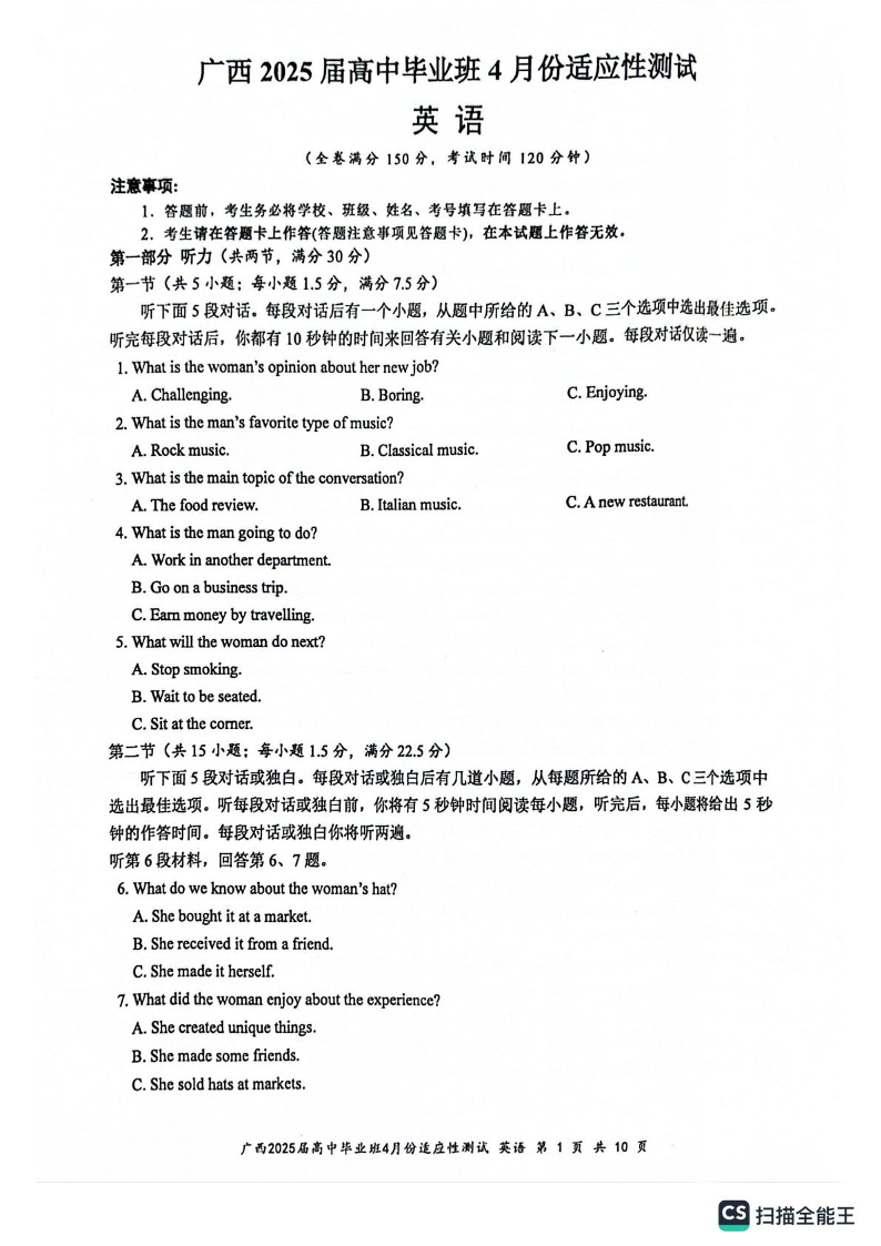 广西2025届高中毕业班4月适应性测试 英语.pdf