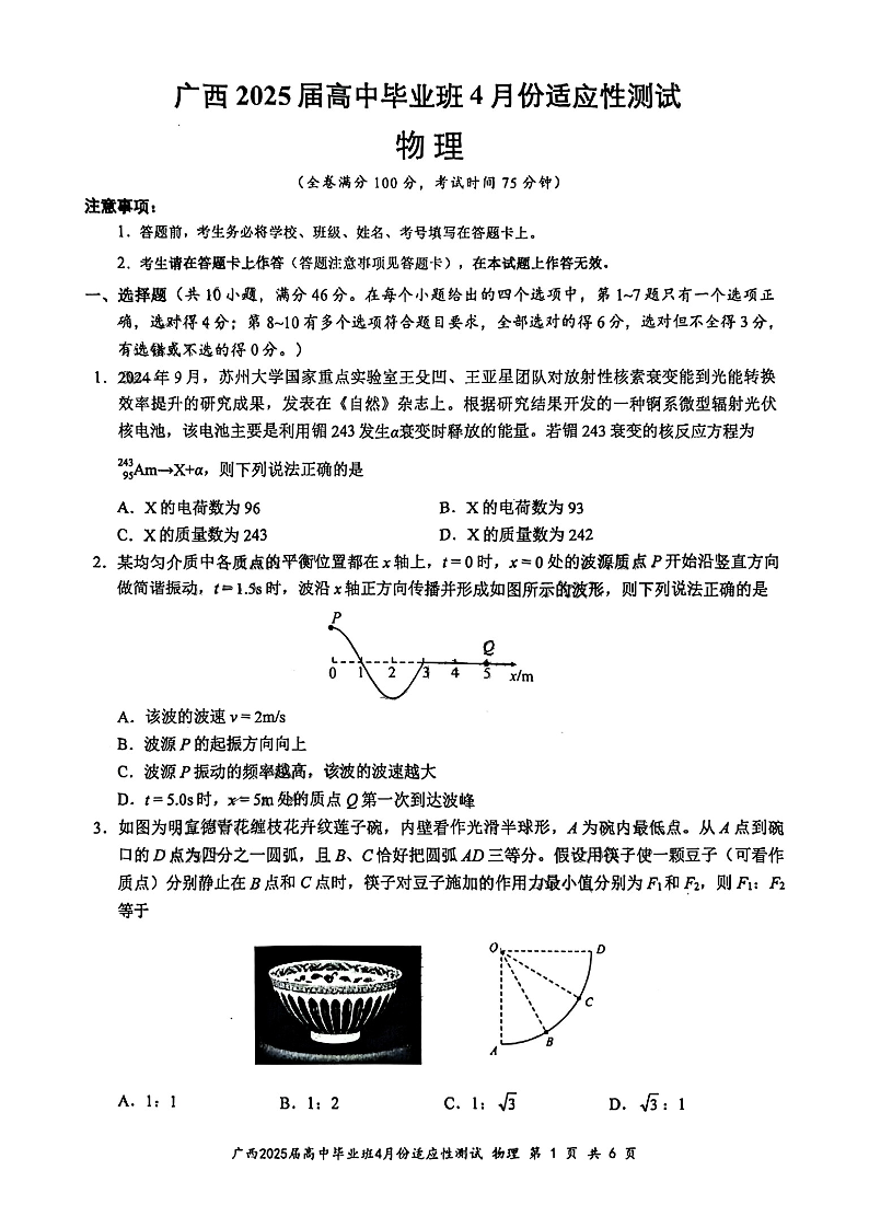 广西2025届高中毕业班4月适应性测试 物理(含答案).pdf