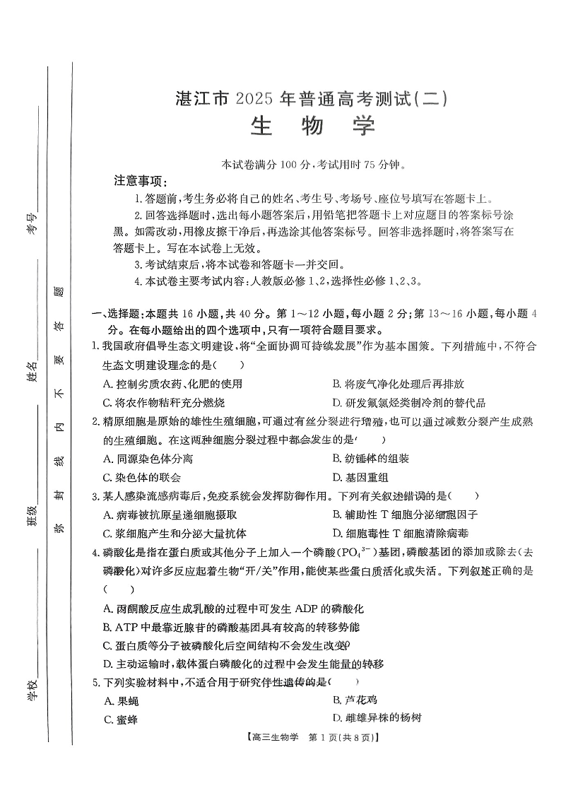 广东省湛江市2025年普通高考测试(二)生物.pdf