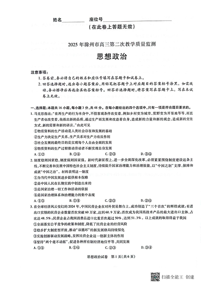安徽省滁州市2025届高三第二次教学质量监测(滁州二模)政治(含答案).pdf