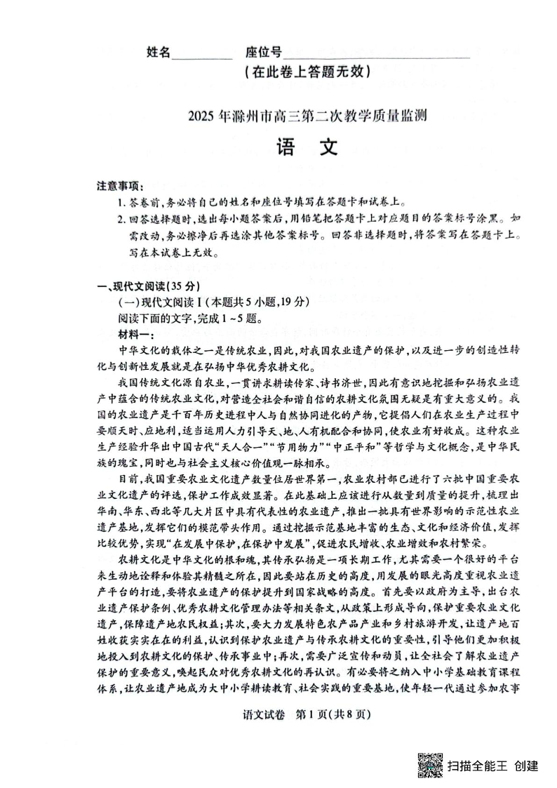 安徽省滁州市2025届高三第二次教学质量监测(滁州二模)语文(含答案).pdf