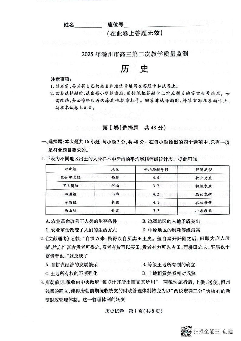 安徽省滁州市2025届高三第二次教学质量监测(滁州二模)历史(含答案).pdf