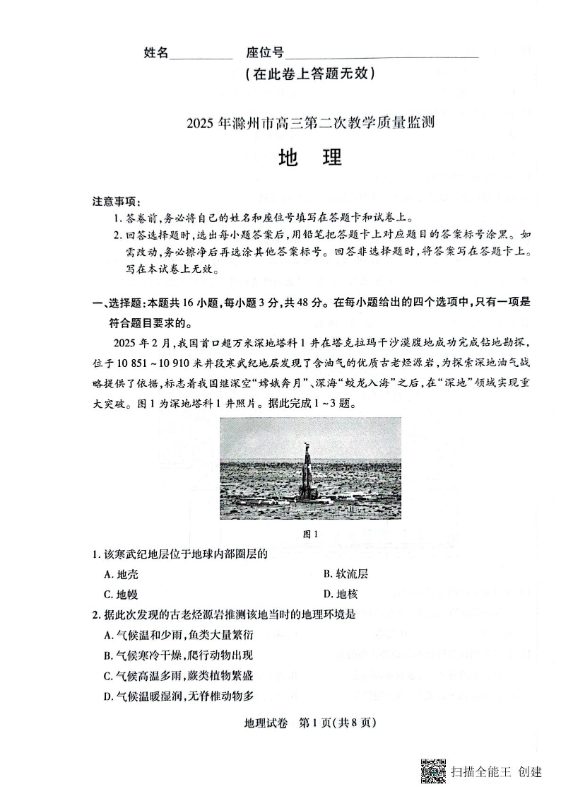 安徽省滁州市2025届高三第二次教学质量监测(滁州二模)地理(含答案).pdf