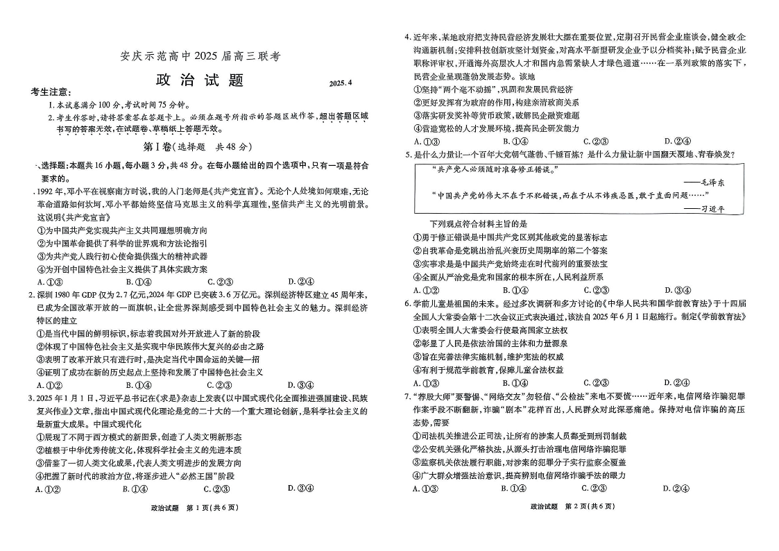 安徽省安庆市示范高中暨江淮十校2025届高三第三次联考 政治.pdf