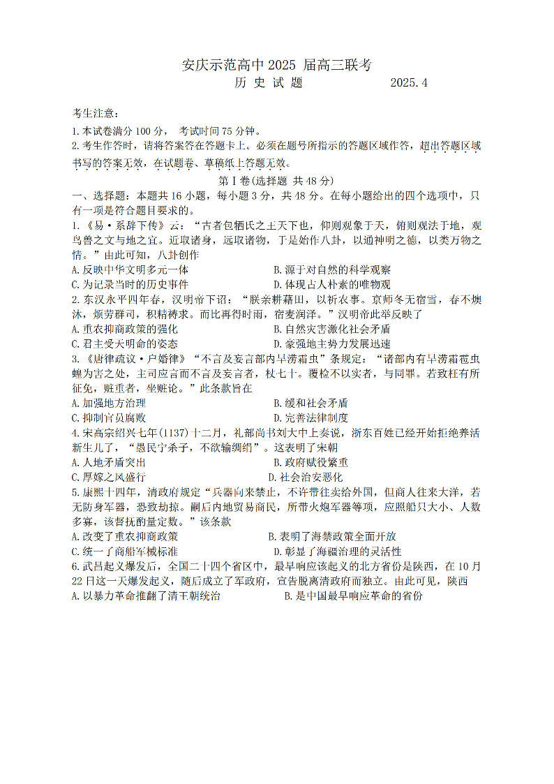 安徽省安庆市示范高中暨江淮十校2025届高三第三次联考 历史.pdf