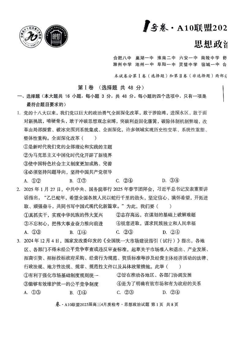 安徽省1号卷A0联盟2025届高三4月质检考 政治.pdf