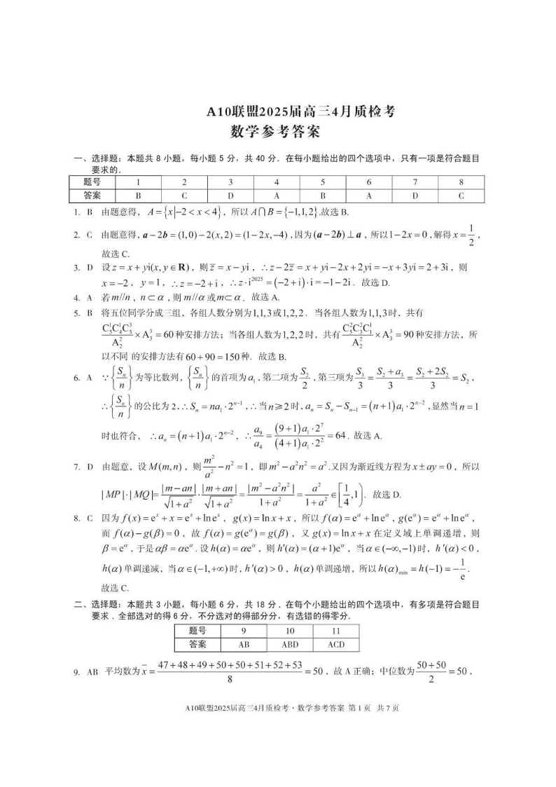 安徽省1号卷A0联盟2025届高三4月质检考 数学答案.pdf