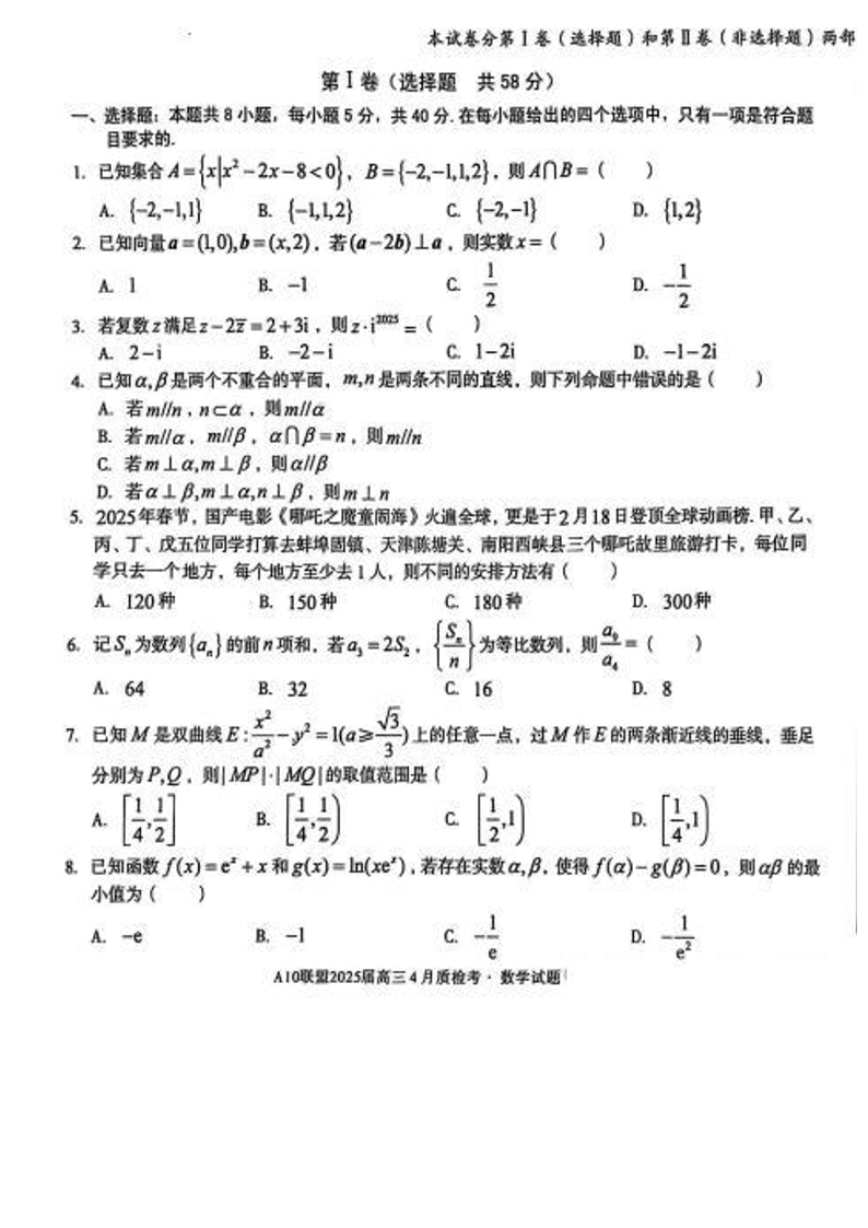 安徽省1号卷A0联盟2025届高三4月质检考 数学.pdf