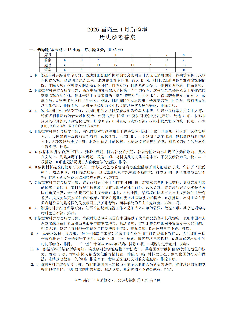 安徽省1号卷A0联盟2025届高三4月质检考 历史答案.pdf