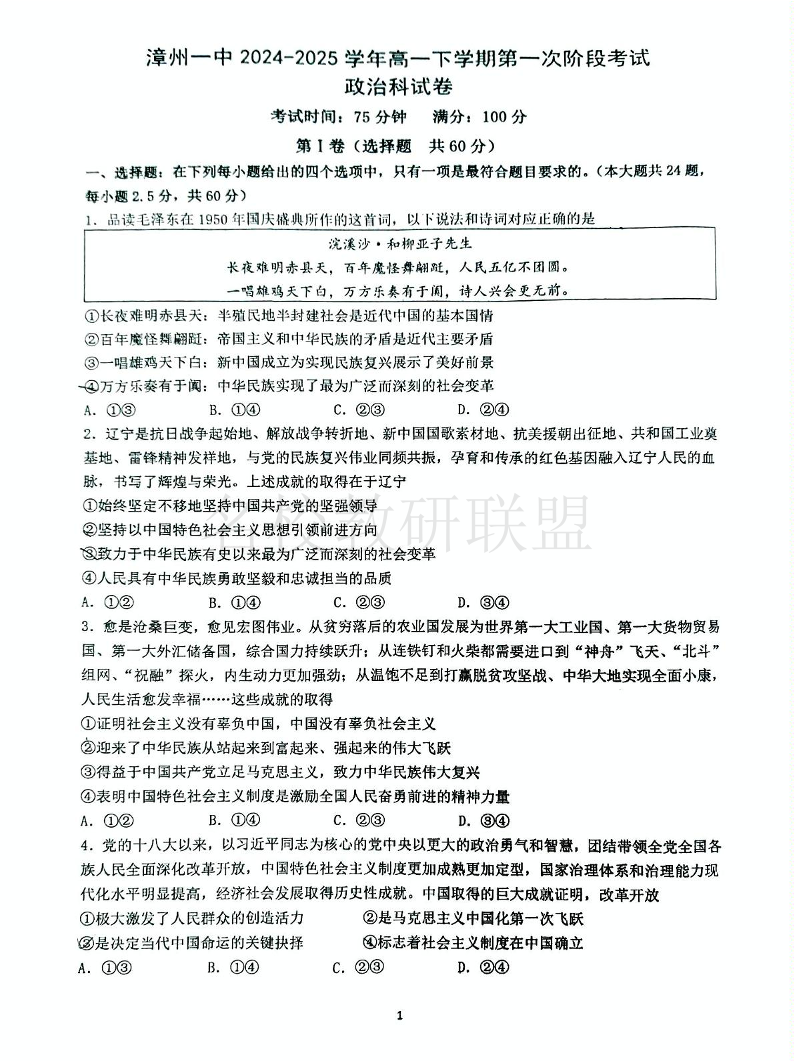 福建省漳州第一中学2024-2025学年高一下学期第一次阶段考试 政治(含答案).pdf