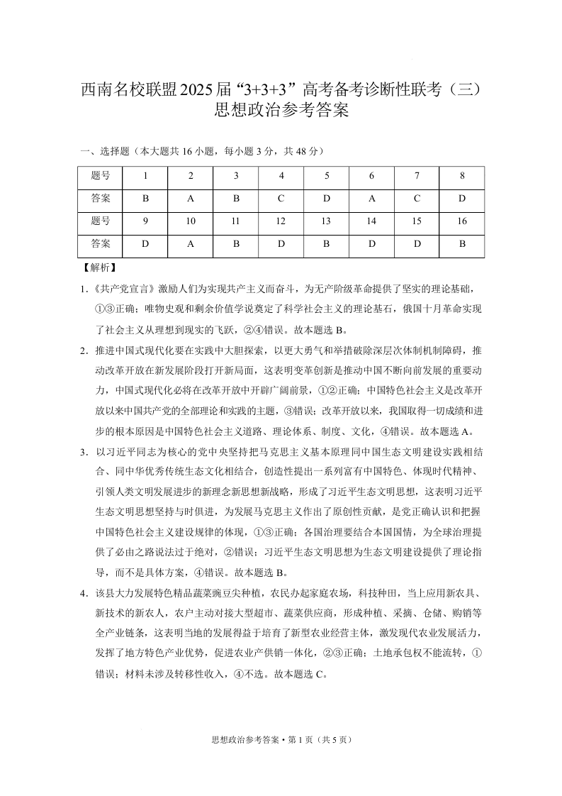 西南名校联盟2025届高三下学期“3+3+3”高考备考诊断性联考(三)政治答案.docx