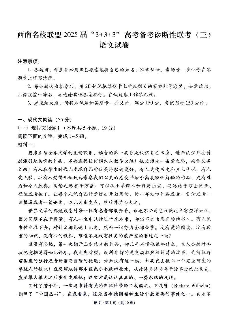 西南名校联盟2025届高三下学期“3+3+3”高考备考诊断性联考(三)语文.pdf