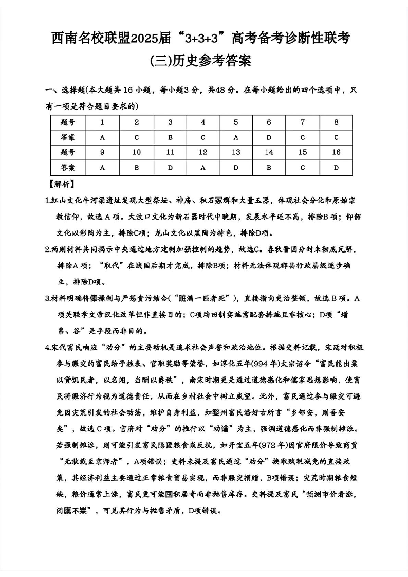 西南名校联盟2025届高三下学期“3+3+3”高考备考诊断性联考(三)历史答案.pdf