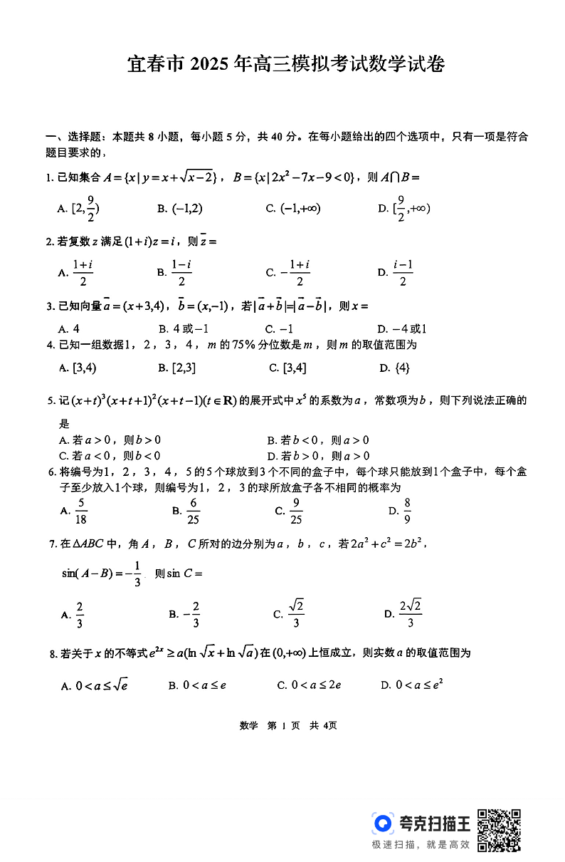 江西省宜春市2025届高三下学期4月模拟考试 数学(含答案).pdf