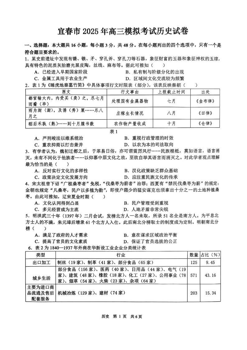 江西省宜春市2025届高三下学期4月模拟考试 历史(含答案).pdf