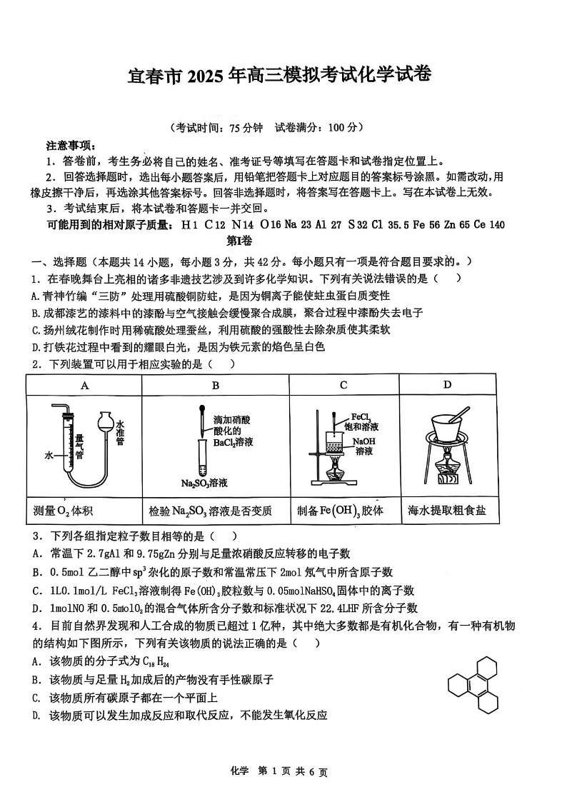 江西省宜春市2025届高三下学期4月模拟考试 化学(含答案).pdf