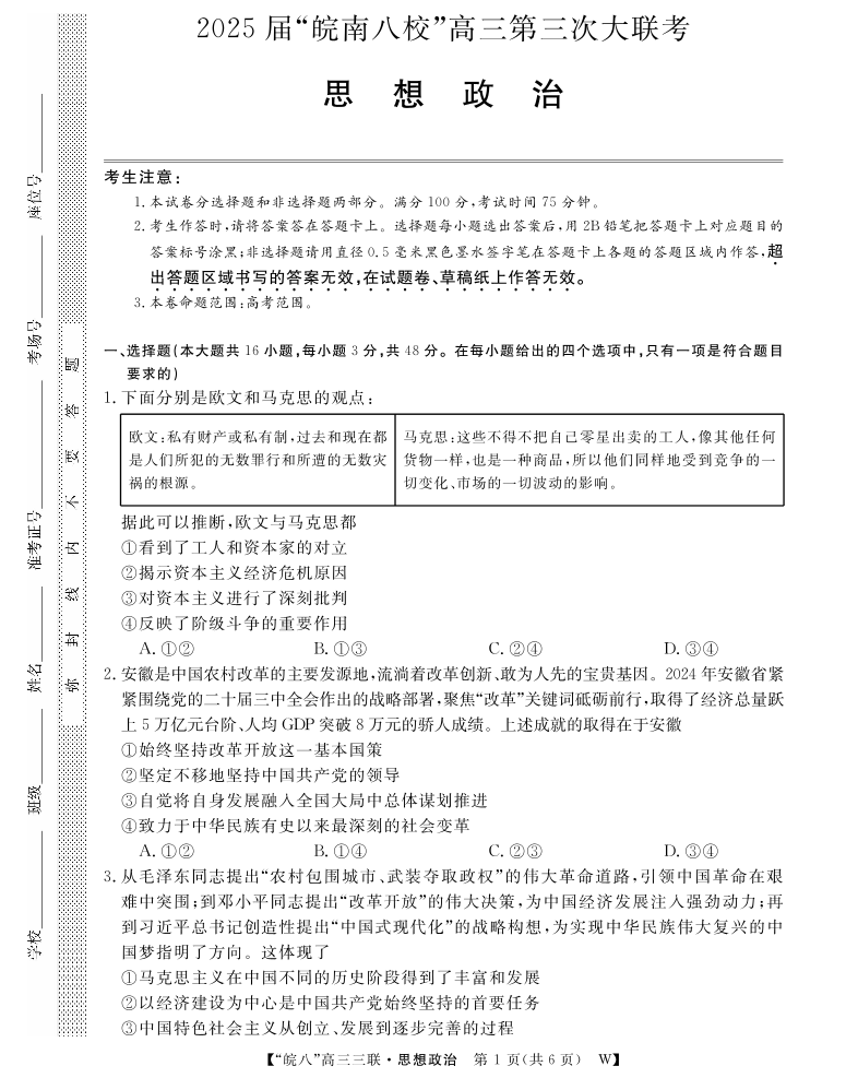 安徽省皖南八校2025届高三第三次大联考 政治.pdf