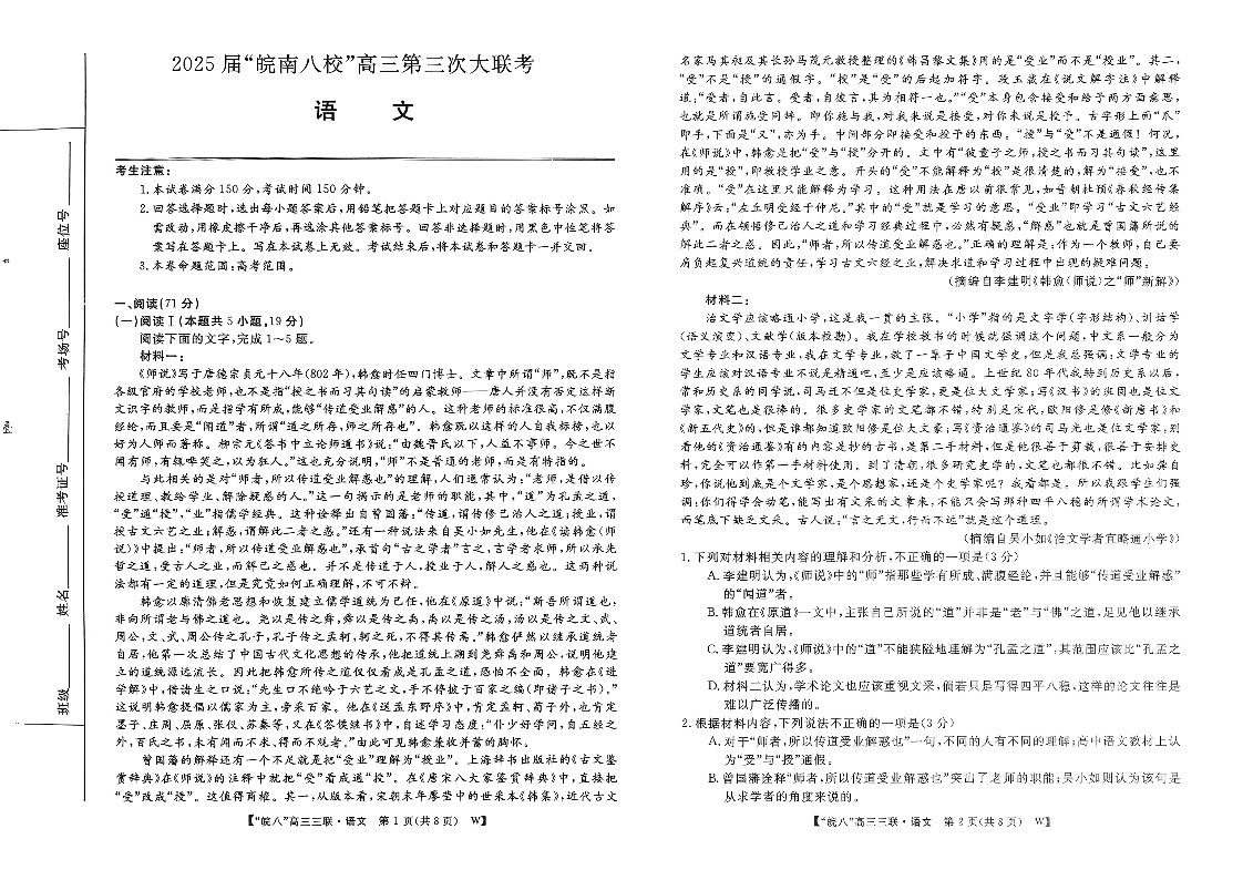 安徽省皖南八校2025届高三第三次大联考 语文.pdf