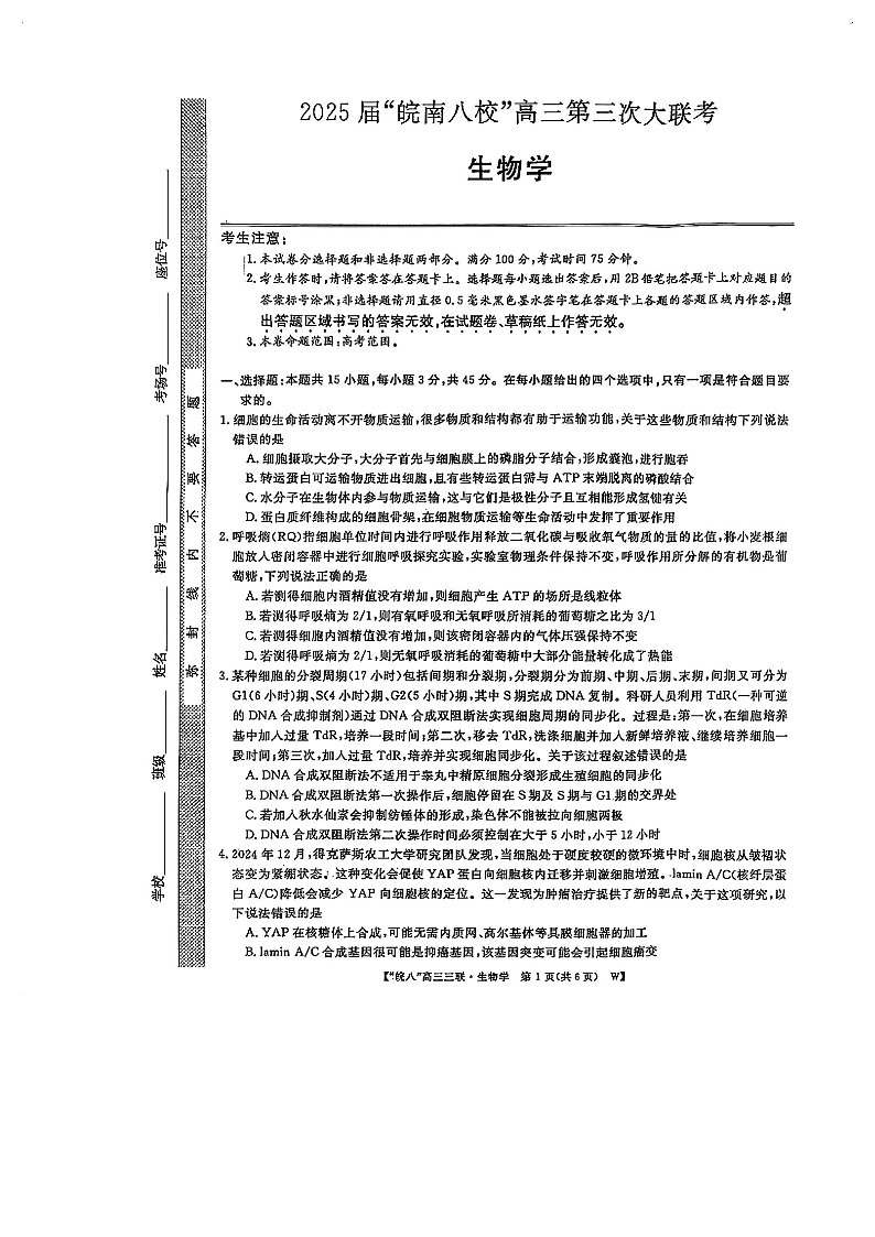 安徽省皖南八校2025届高三第三次大联考 生物.pdf