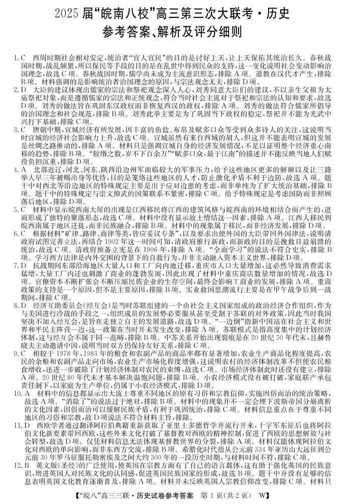安徽省皖南八校2025届高三第三次大联考 历史答案.pdf