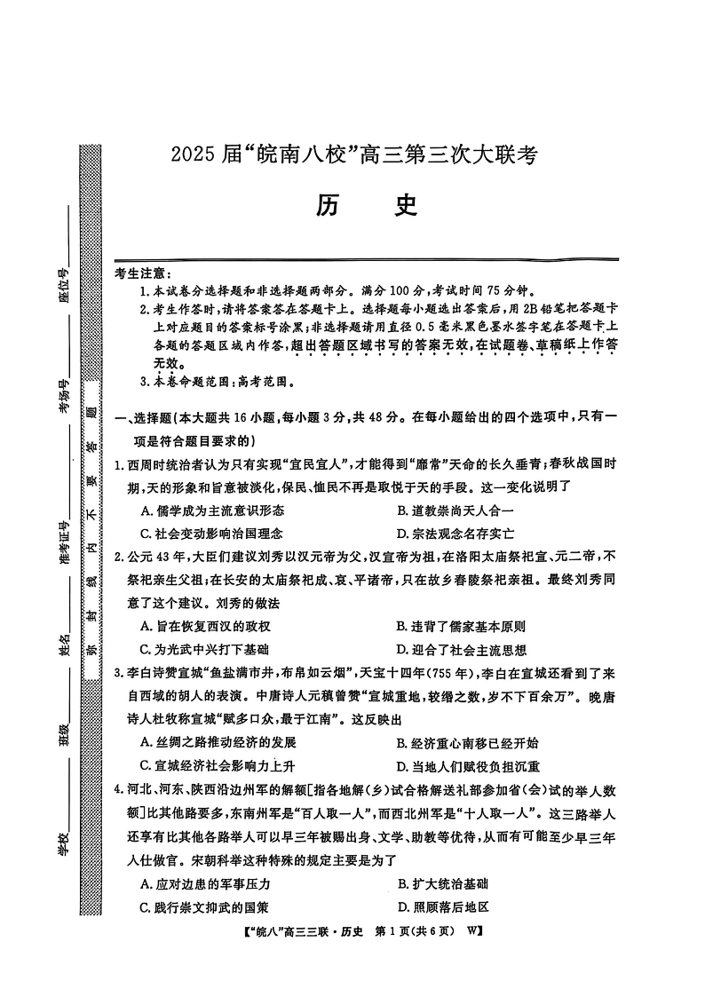 安徽省皖南八校2025届高三第三次大联考 历史.pdf