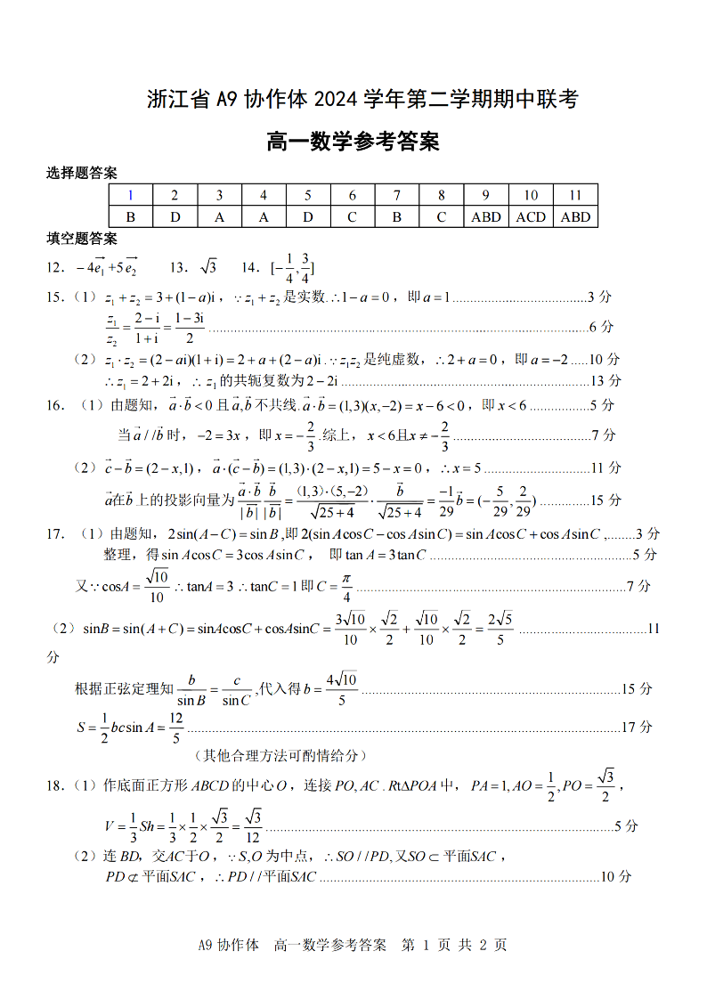 浙江省A9协作体2024学年高一第二学期期中联考 数学答案.pdf