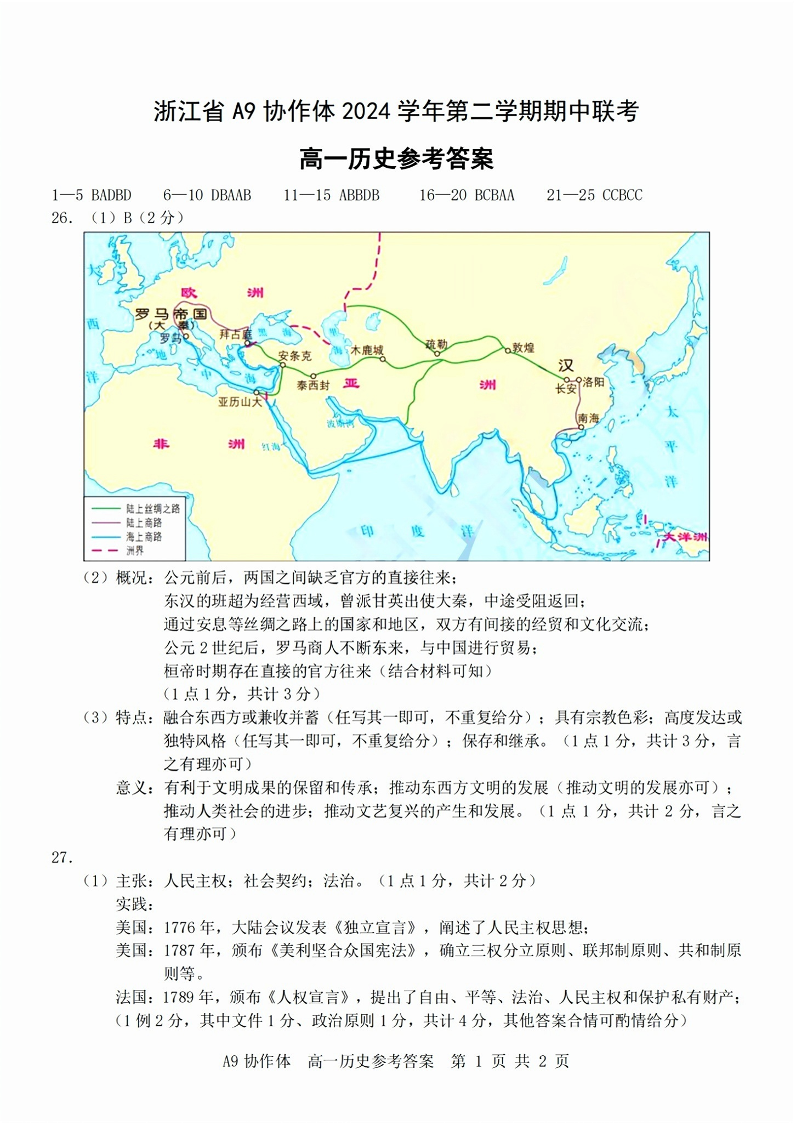 浙江省A9协作体2024学年高一第二学期期中联考 历史答案.pdf