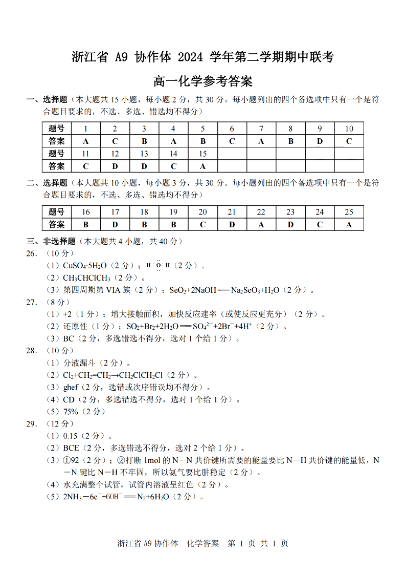 浙江省A9协作体2024学年高一第二学期期中联考 化学答案.pdf