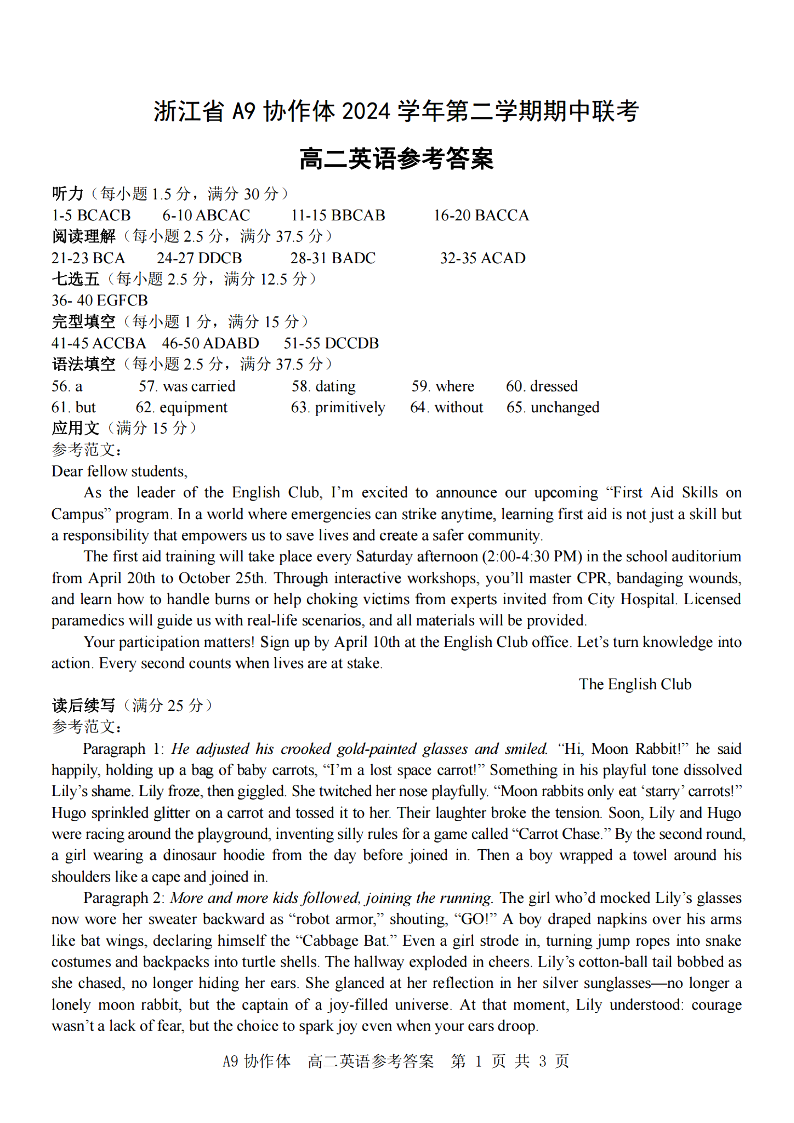 浙江省A9协作体2024学年高二第二学期期中联考 英语答案.pdf