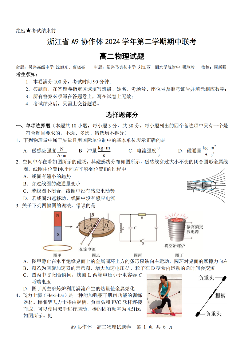 浙江省A9协作体2024学年高二第二学期期中联考 物理.pdf