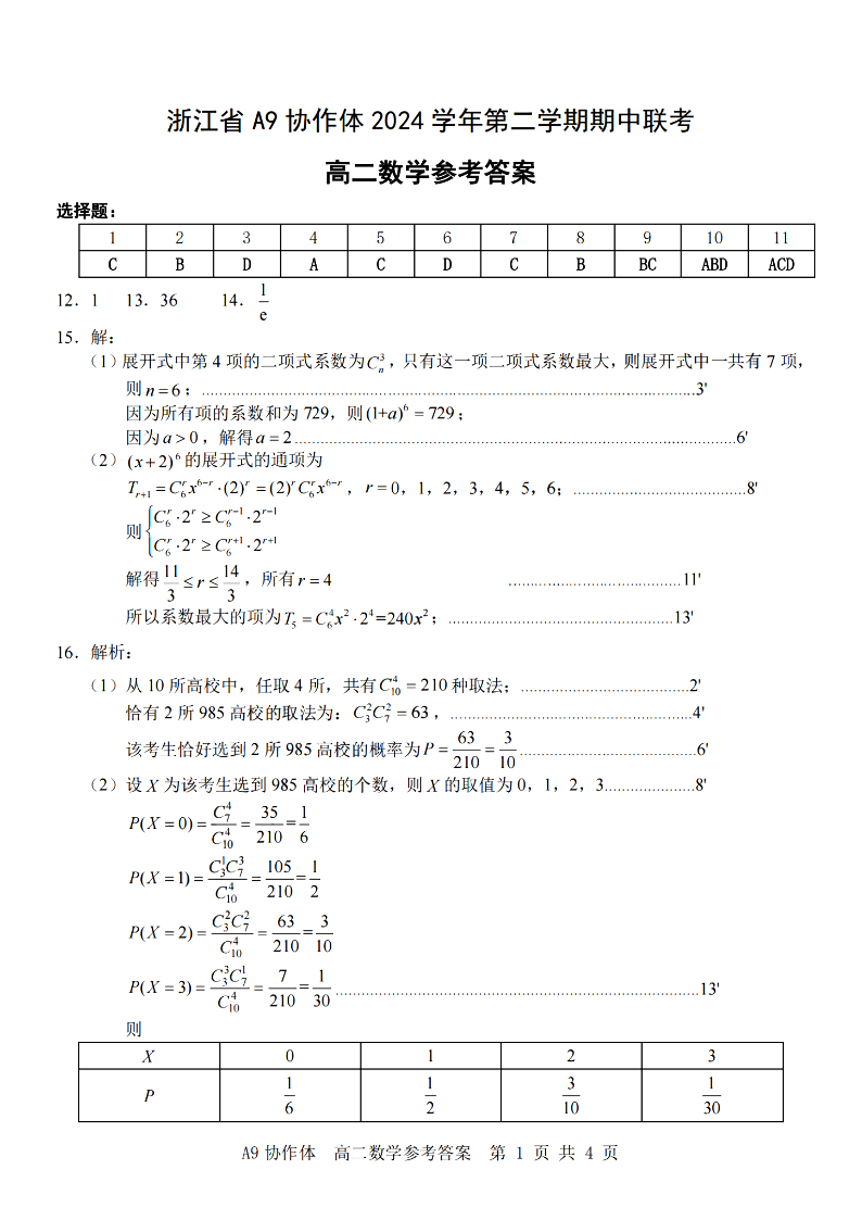 浙江省A9协作体2024学年高二第二学期期中联考 数学答案.pdf