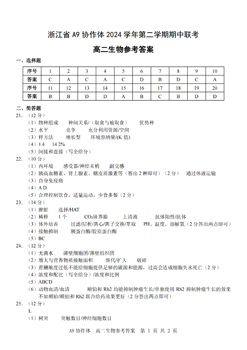 浙江省A9协作体2024学年高二第二学期期中联考 生物答案.pdf