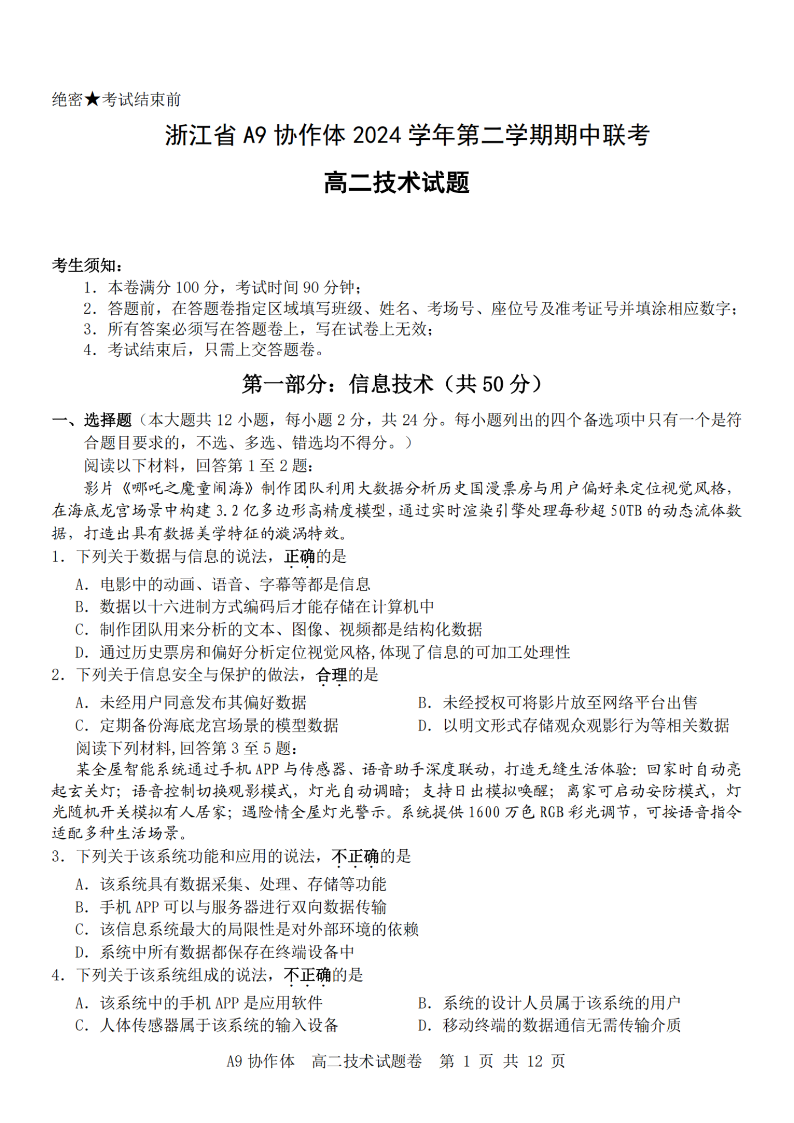 浙江省A9协作体2024学年高二第二学期期中联考 技术.pdf