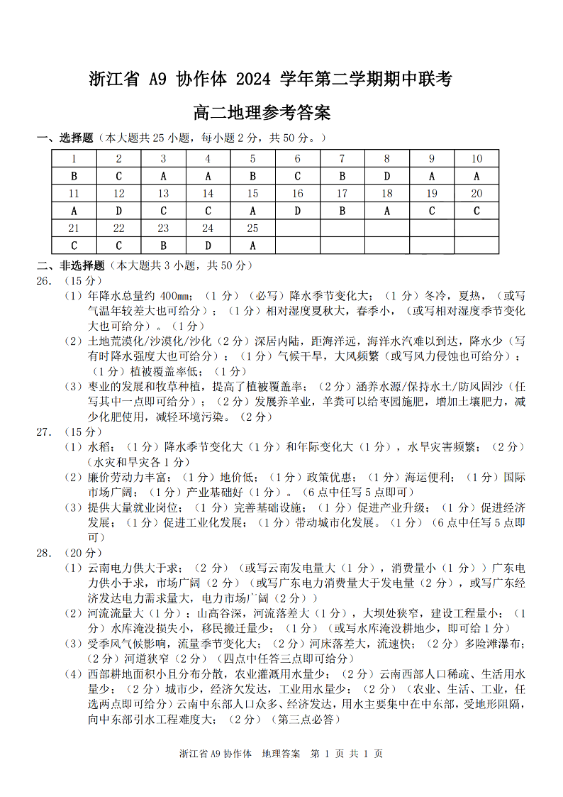 浙江省A9协作体2024学年高二第二学期期中联考 地理答案.pdf